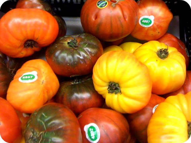 Also, take a look at these spectacular heirloom tomatoes I found in the grocery this afternoon (whilst on my way to the kale) Aren't they the most beautiful shapes and colors? Heirloom means the seeds aren't genetically altered, so these guys look like they did before all that science [crap] was invented. They also taste worlds better!!
